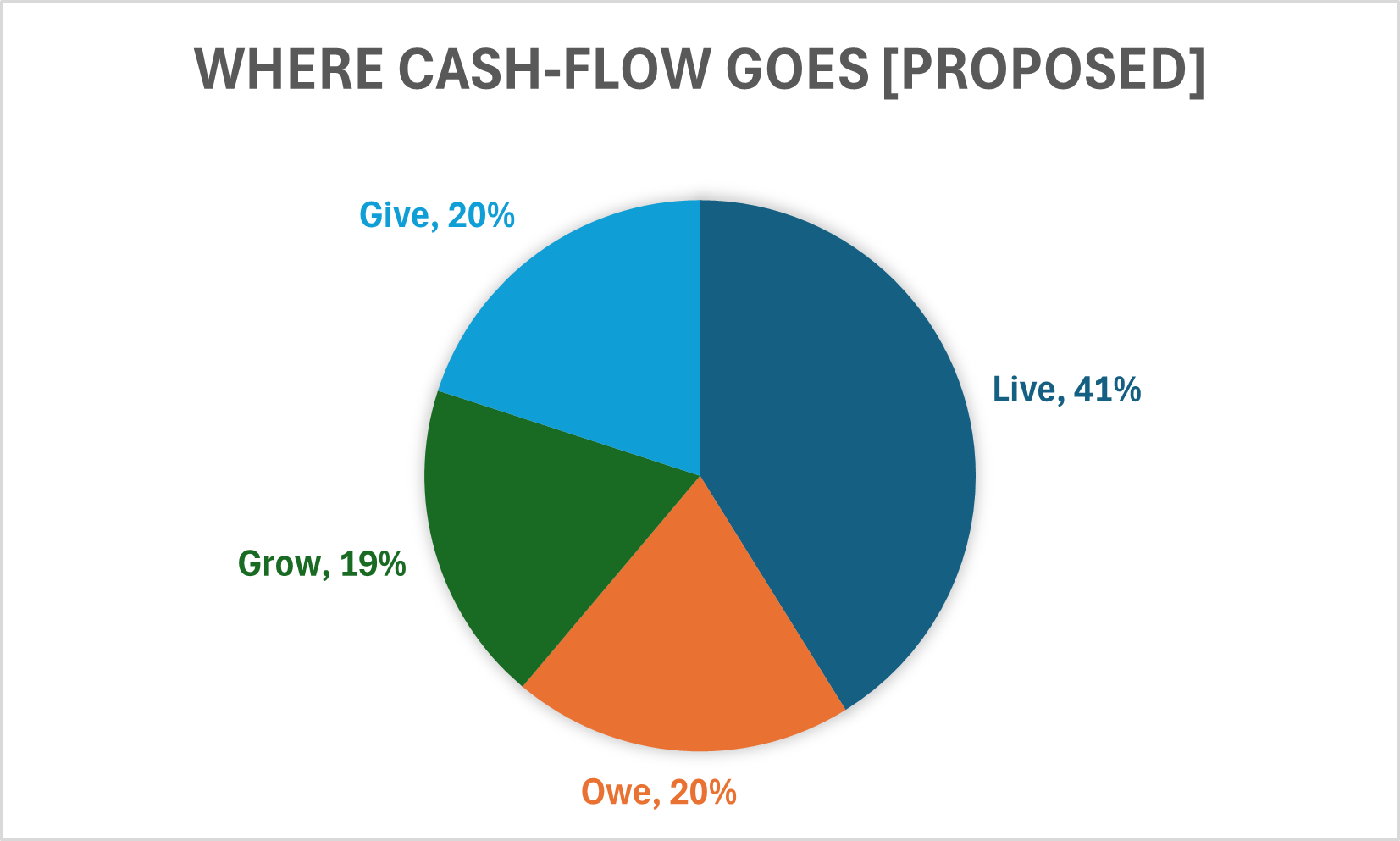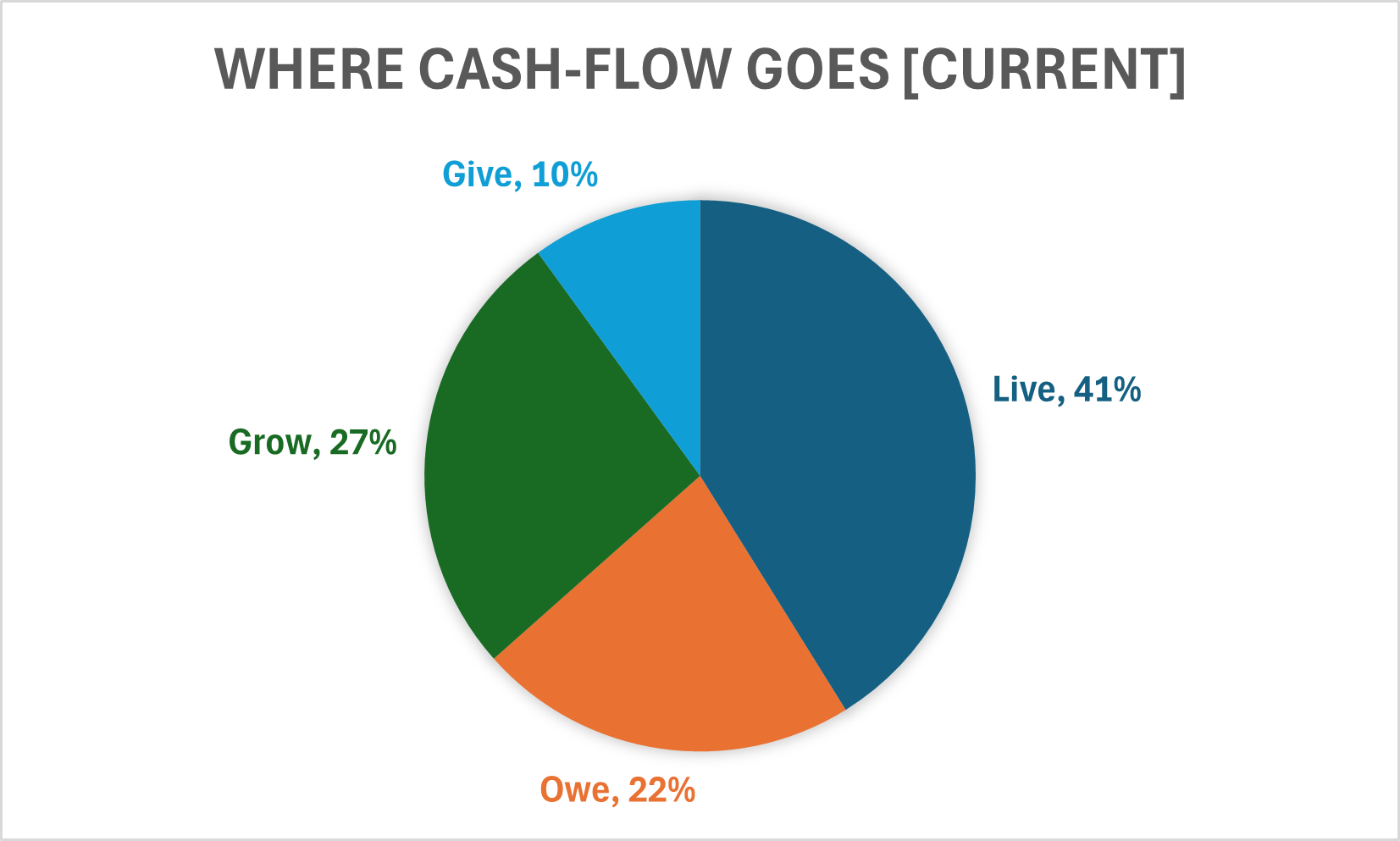 John and Carrie currently give 10% of their income, have an average tax rate of 22% , spend 41% of their income ($12k per month), and save the residual 27% of their income. Their cash-flow allocation currently looks like this: